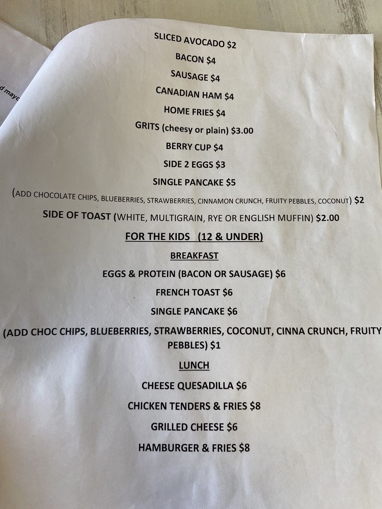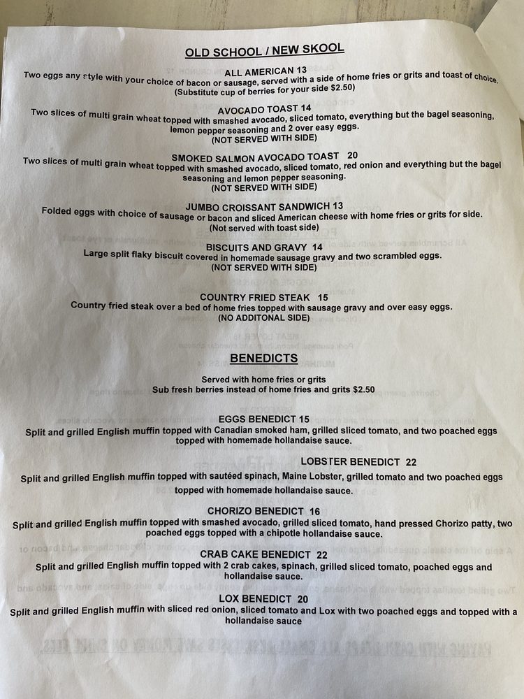 Main lobster, shrimp and blue crab meat scrambled together and topped with sliced tomato avocado and hollandaise sauce.Served with home fries or cheddar grits and white or wheat toast
